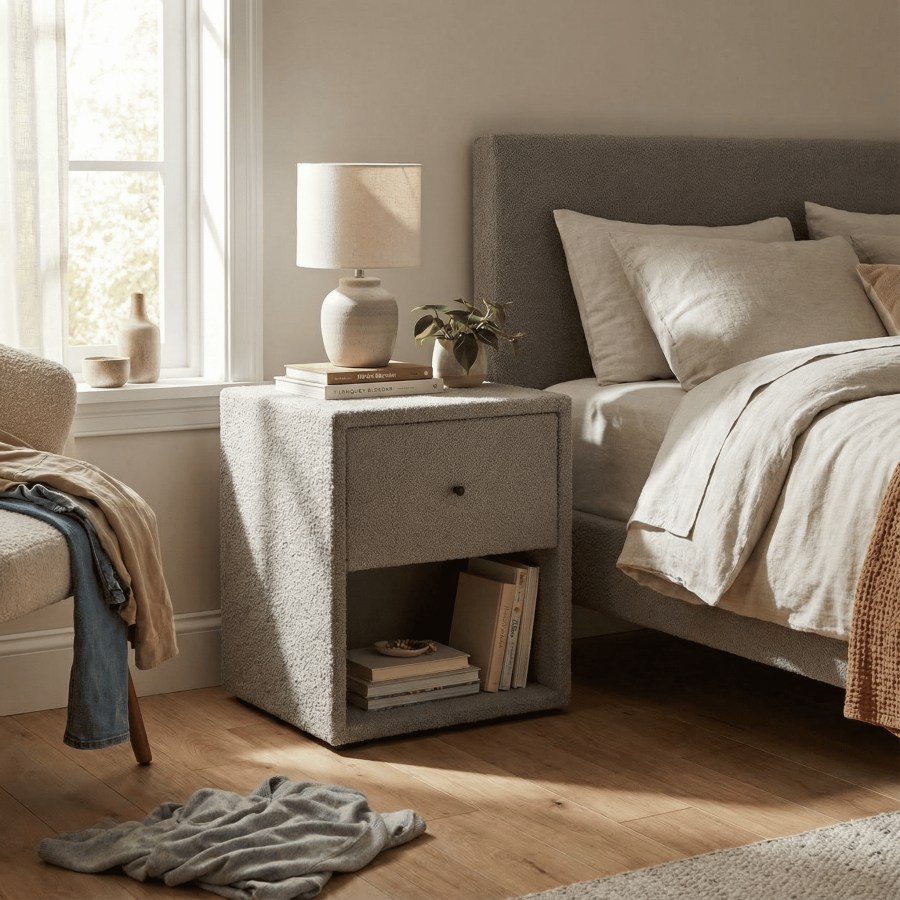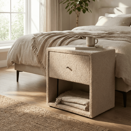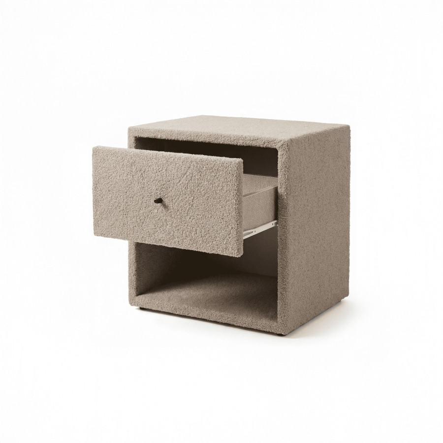 TEDDY naktinė spintelė prie lovos – stilingas ir jaukus pasirinkimas moderniam interjerui. Aptraukta minkštu teddy audiniu kuris naudojamas ir mūsų lovose ,,Lorena", ,,Freja" ir ,,Lesteris", ji suteikia šilumos pojūtį ir išskirtinį dizainą, kuris puikiai dera tiek miegamajame, tiek svetainėje.