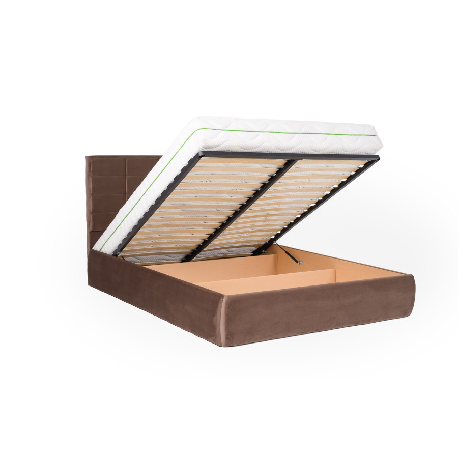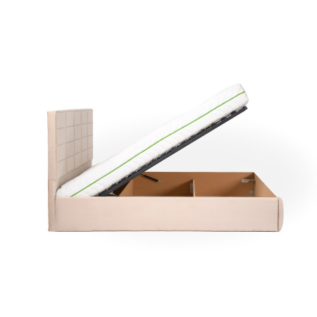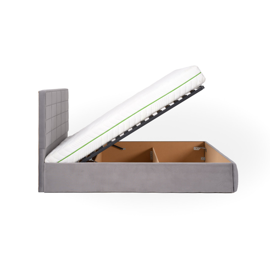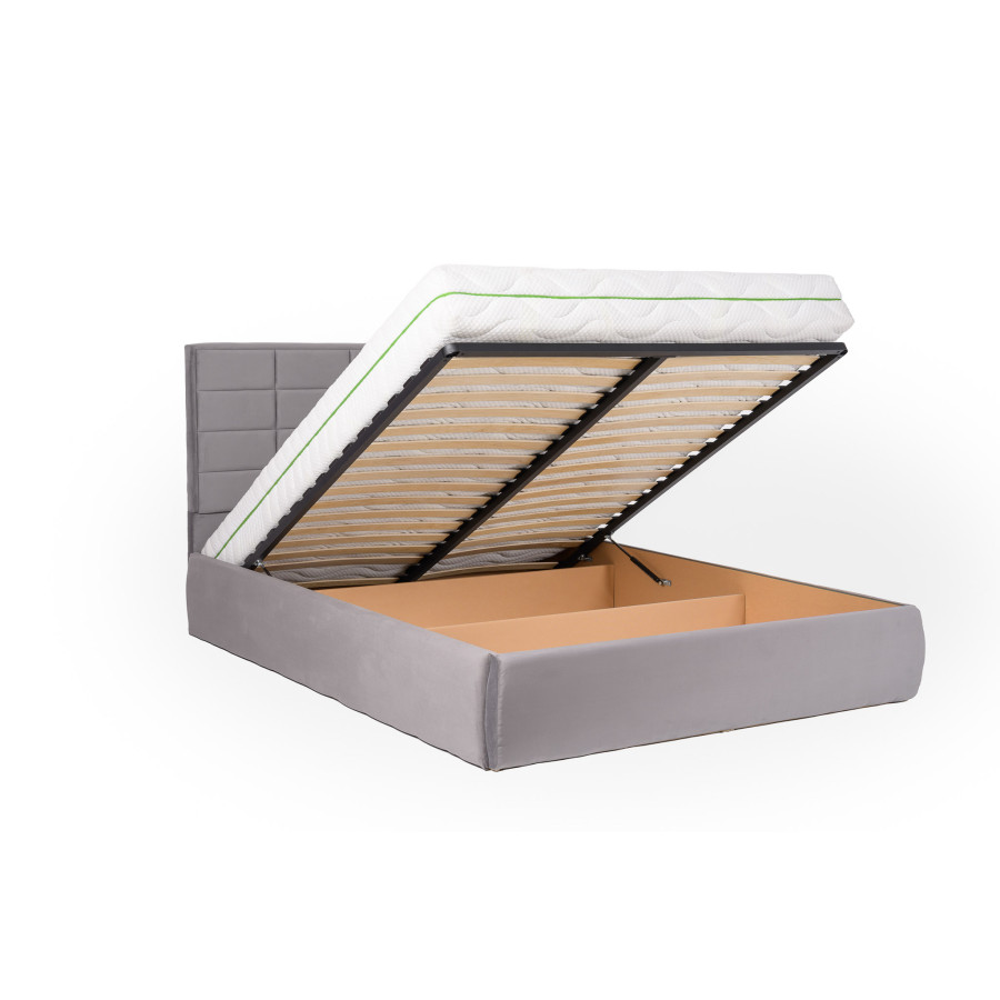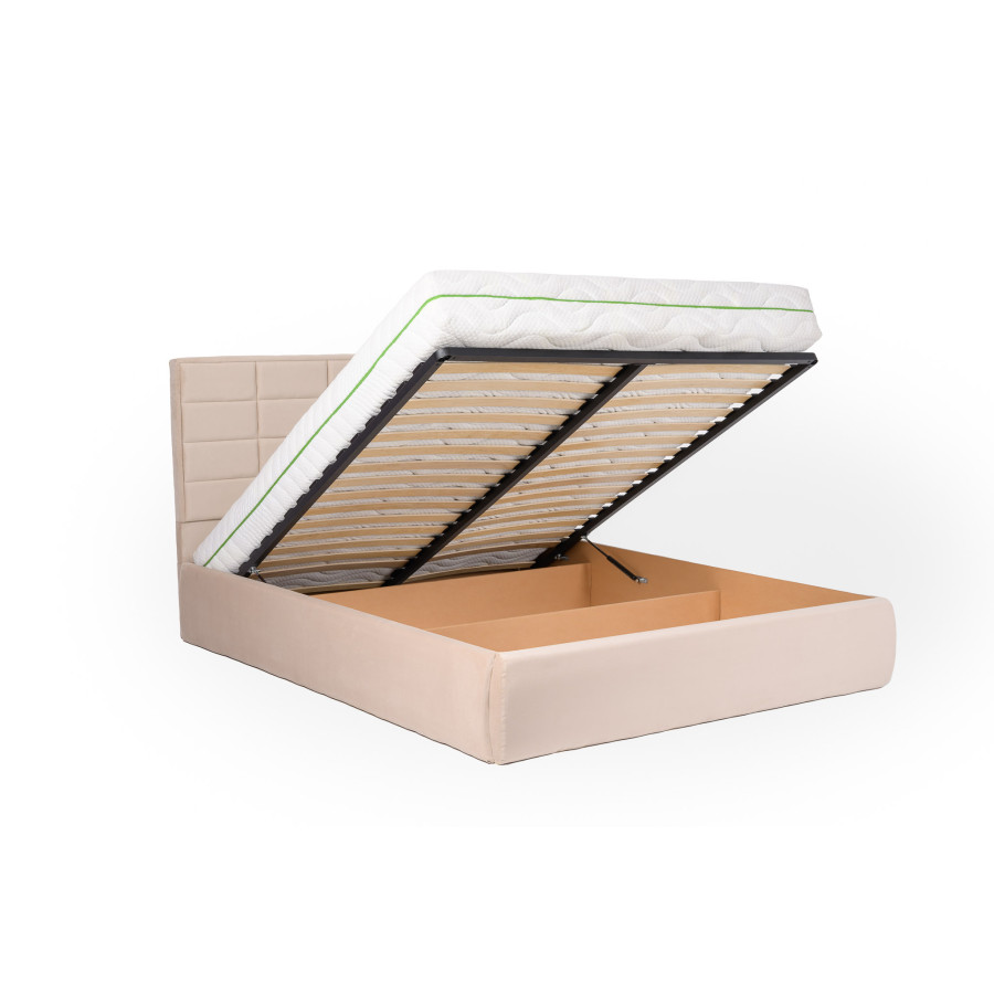 Ši lova turi erdvią patalynės dėžę, lengvai atsidarančią iš galinės pusės, tad visada turėsite vietos patalynėms ir kitoms smulkmenoms. Tvirtas metalinis grotelių rėmas ir tankios grotelės su vos 5 cm tarpu užtikrina patogų miegą, o 1000 N stiprumo pneumatinių amortizatorių sistema leidžia be vargo atidaryti ir uždaryti dėžę, kad ir koks būtų jūsų čiužinio svoris.